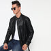 • Band Collar: Stand-up collar with snap-button closure for a sleek biker look.