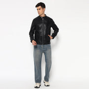 Step up your wardrobe with this Men’s Sleek Black Leather Jacket, a perfect combination of modern sophistication and elegance. Crafted from genuine leather, this bomber jacket features a streamlined outline with a front zip closure, minimalistic panel detailing, and a stand collar for a sharp, contemporary look.