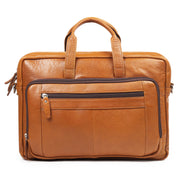 Elevate your professional journey with this sophisticated tan leather briefcase laptop bag, meticulously crafted from premium buffalo leather. Designed for the discerning traveler and business professional, it seamlessly accommodates laptops up to 15.6 inches alongside essential documents and files. Two front zipper pockets provide convenient access to everyday necessities, while sturdy trolley straps allow effortless attachment to luggage handles. The refined modern aesthetic and impeccable craftsmanship make this an indispensable companion for boardrooms and airports alike.
